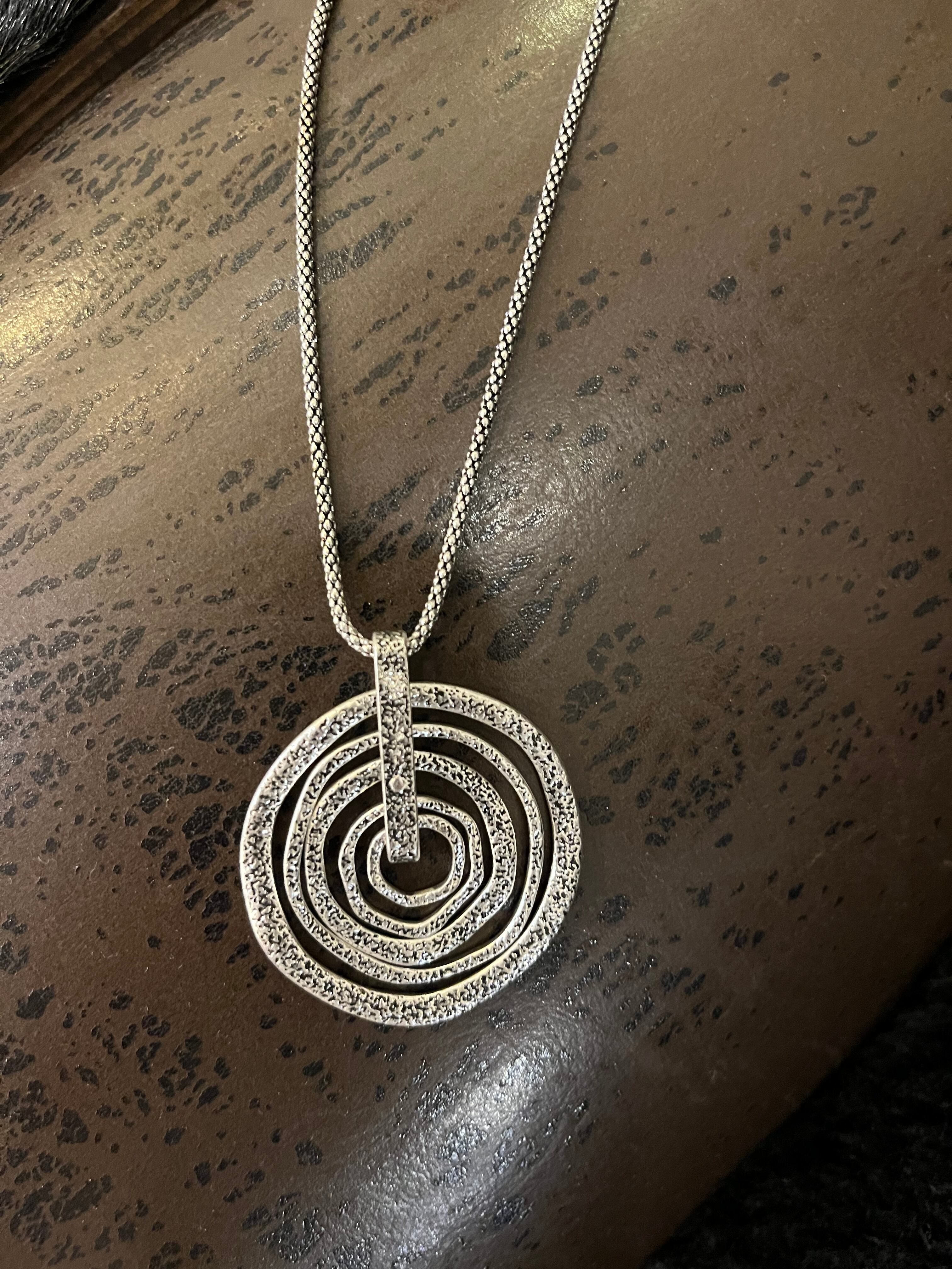 凹凸のある質感と少しいびつなサイクルパーツの渦巻きデザインが魅力的なペンダントです。