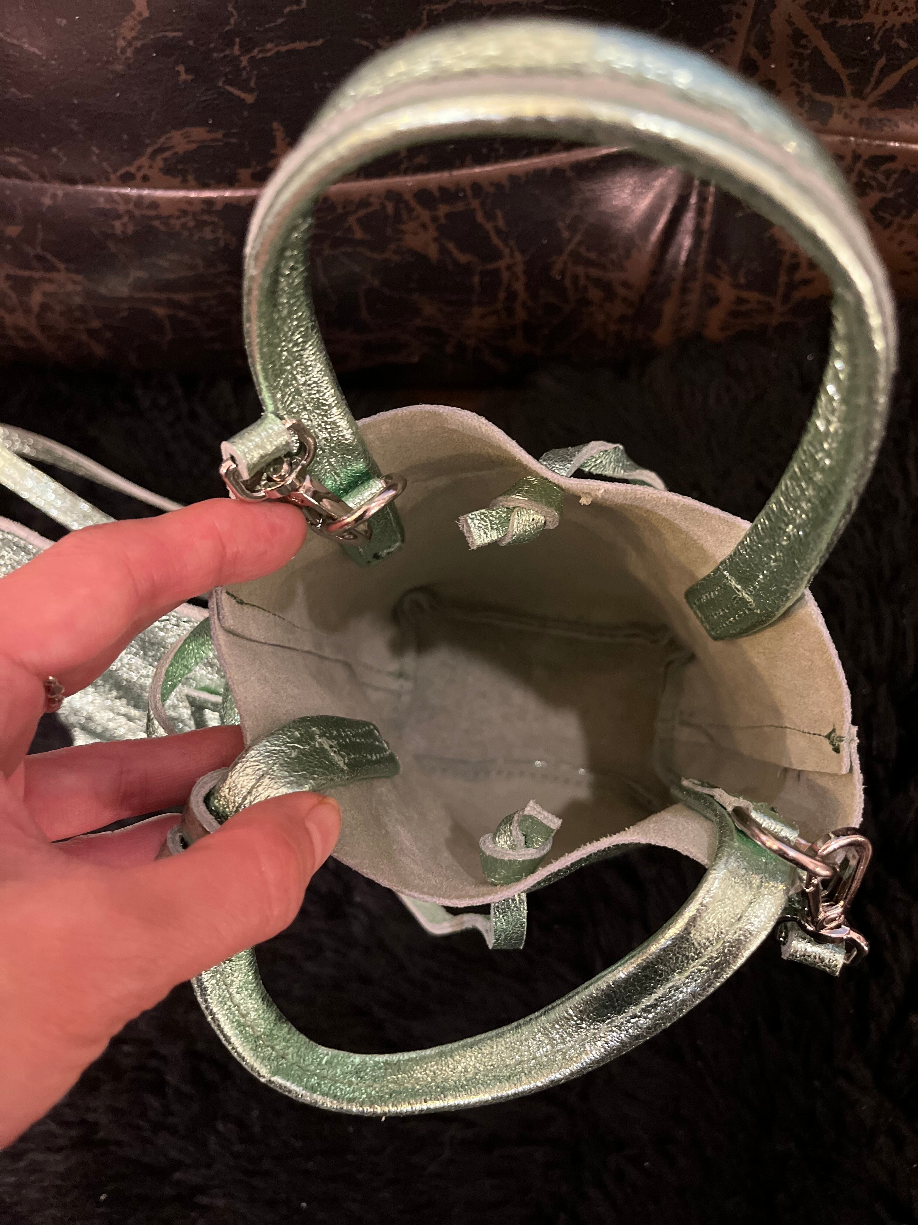 ミントグリーンのメタリックカラーが目を引く、コンパクトなミニサイズの2Wayバックです。