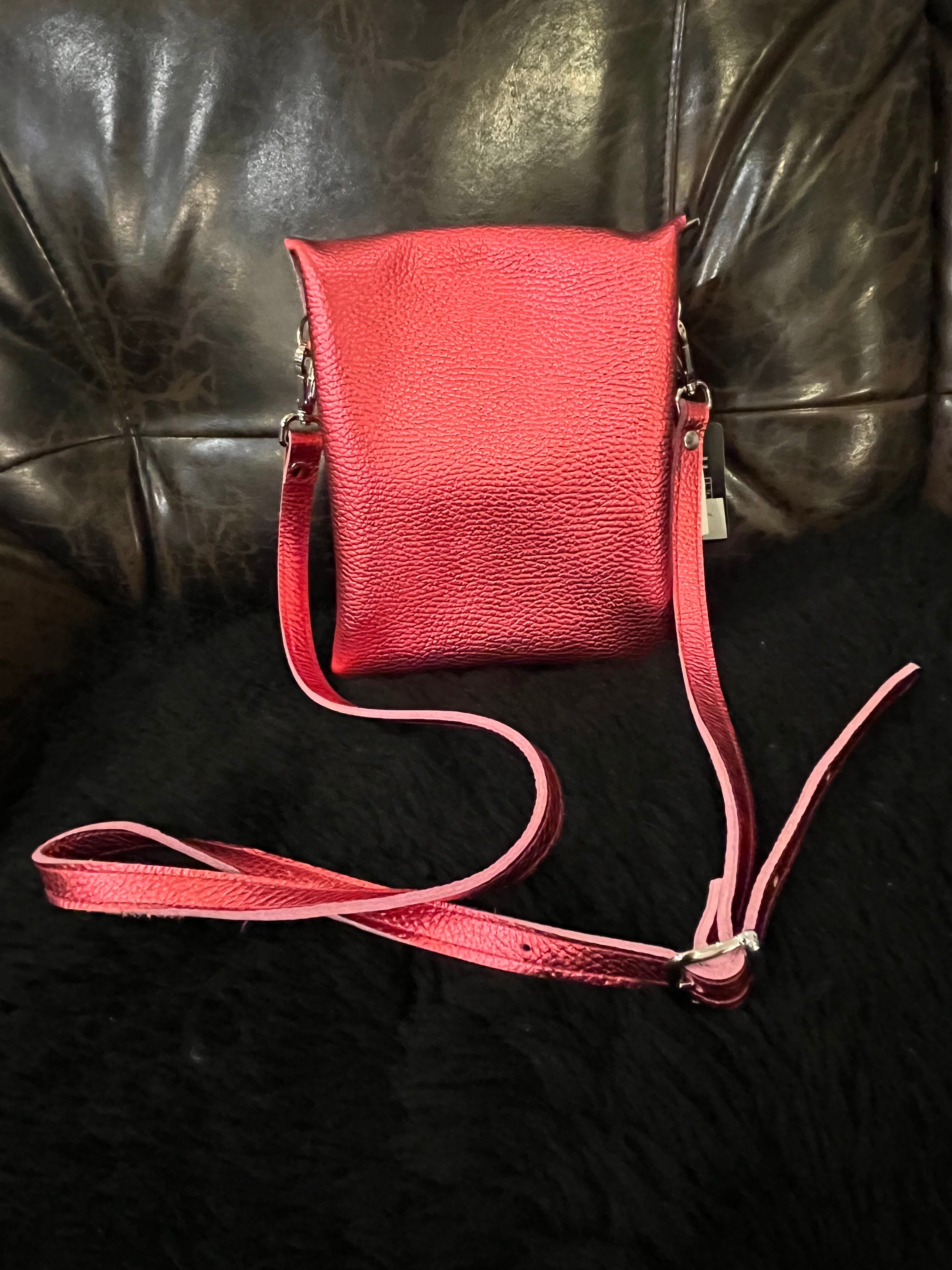 キュートなマゼンタカラーのメタリック加工のレザーポシェット。
