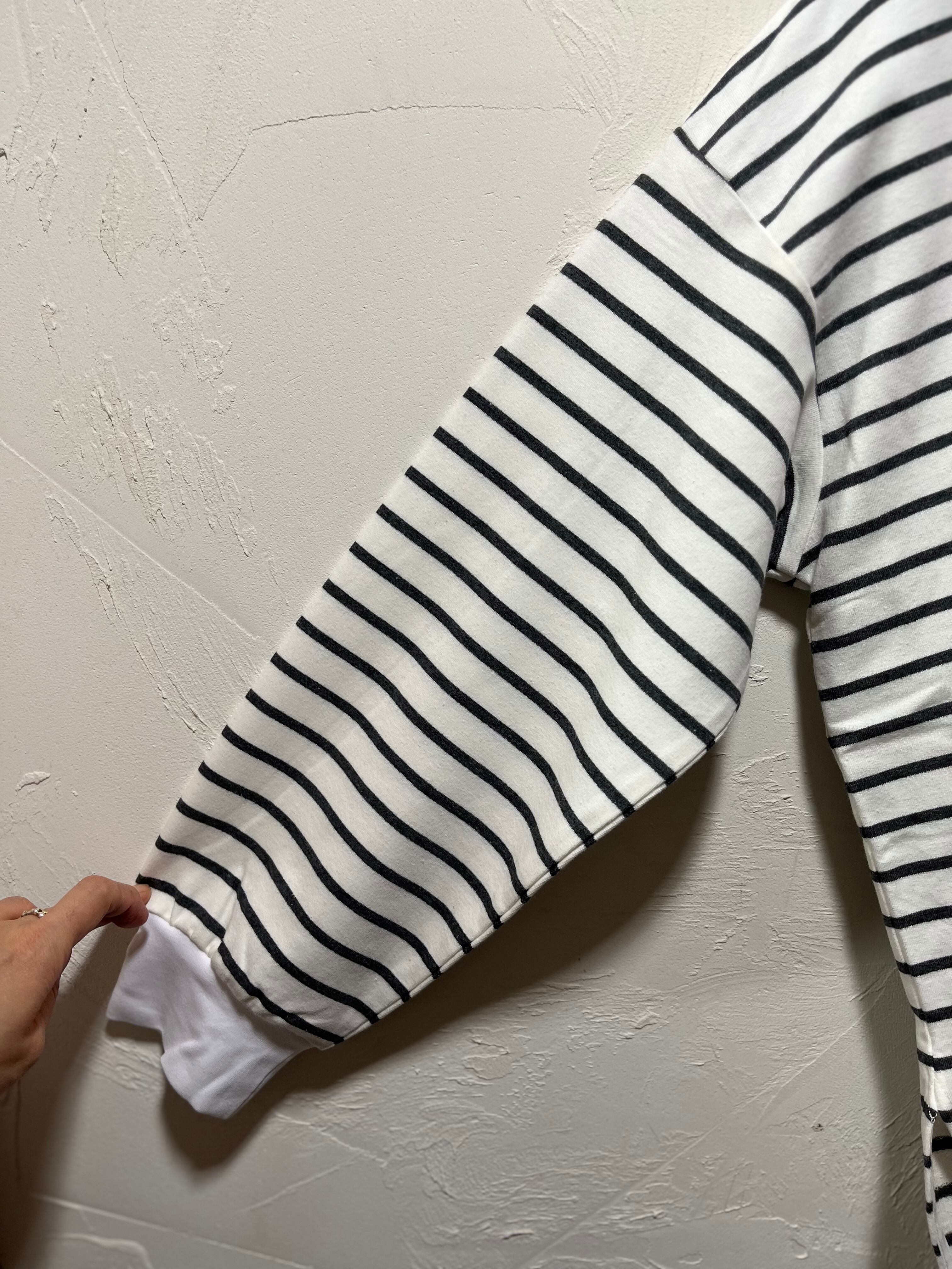 程よい厚さの裏毛ボーダー素材を使用したmite fabricaのボーダーマスコット刺繍EMB裏毛プルオーバー。