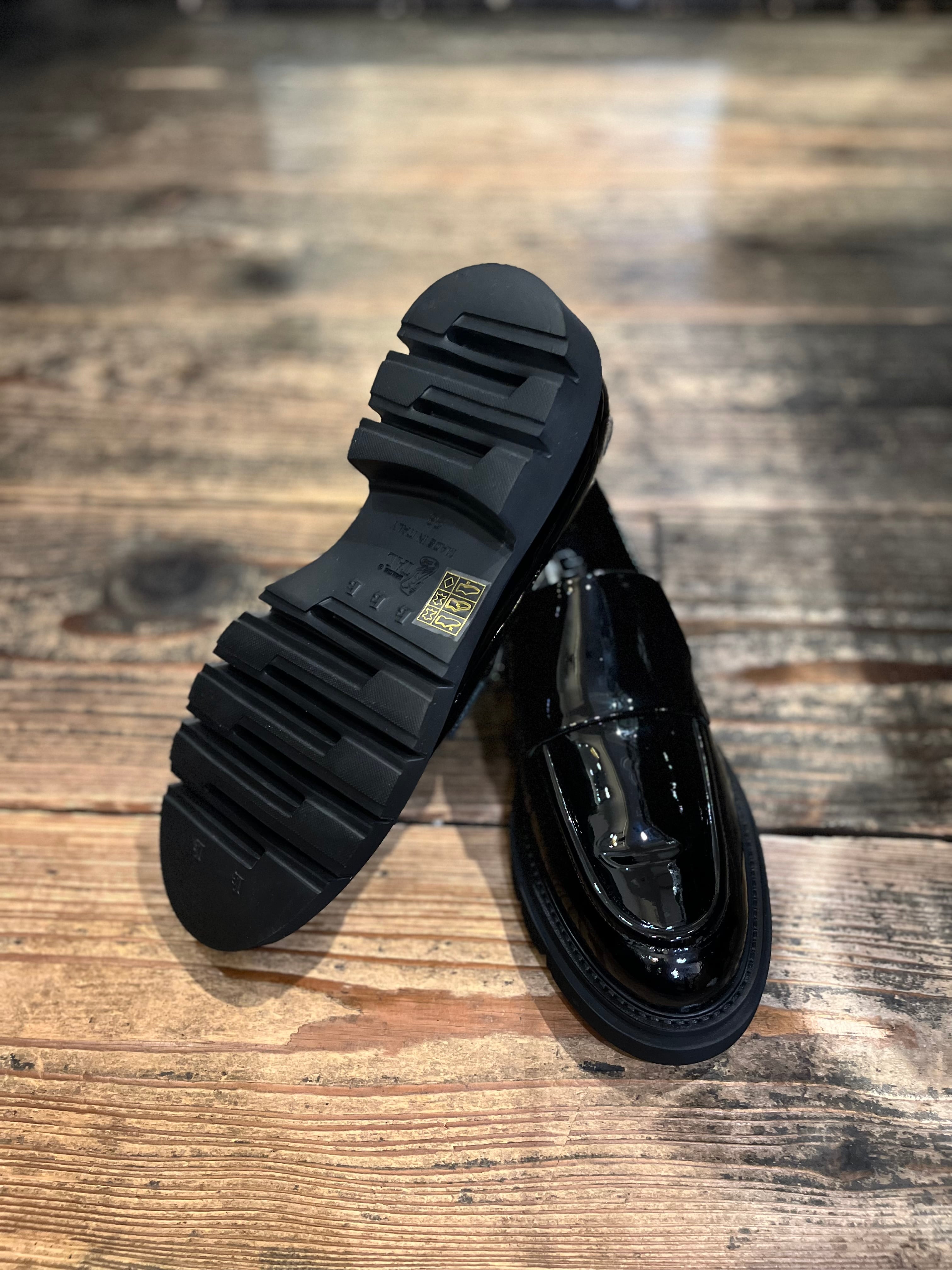 上品な艶感を醸し出すパテントレザーを使用したLUCA GROSSIのパテントレザーローファー。