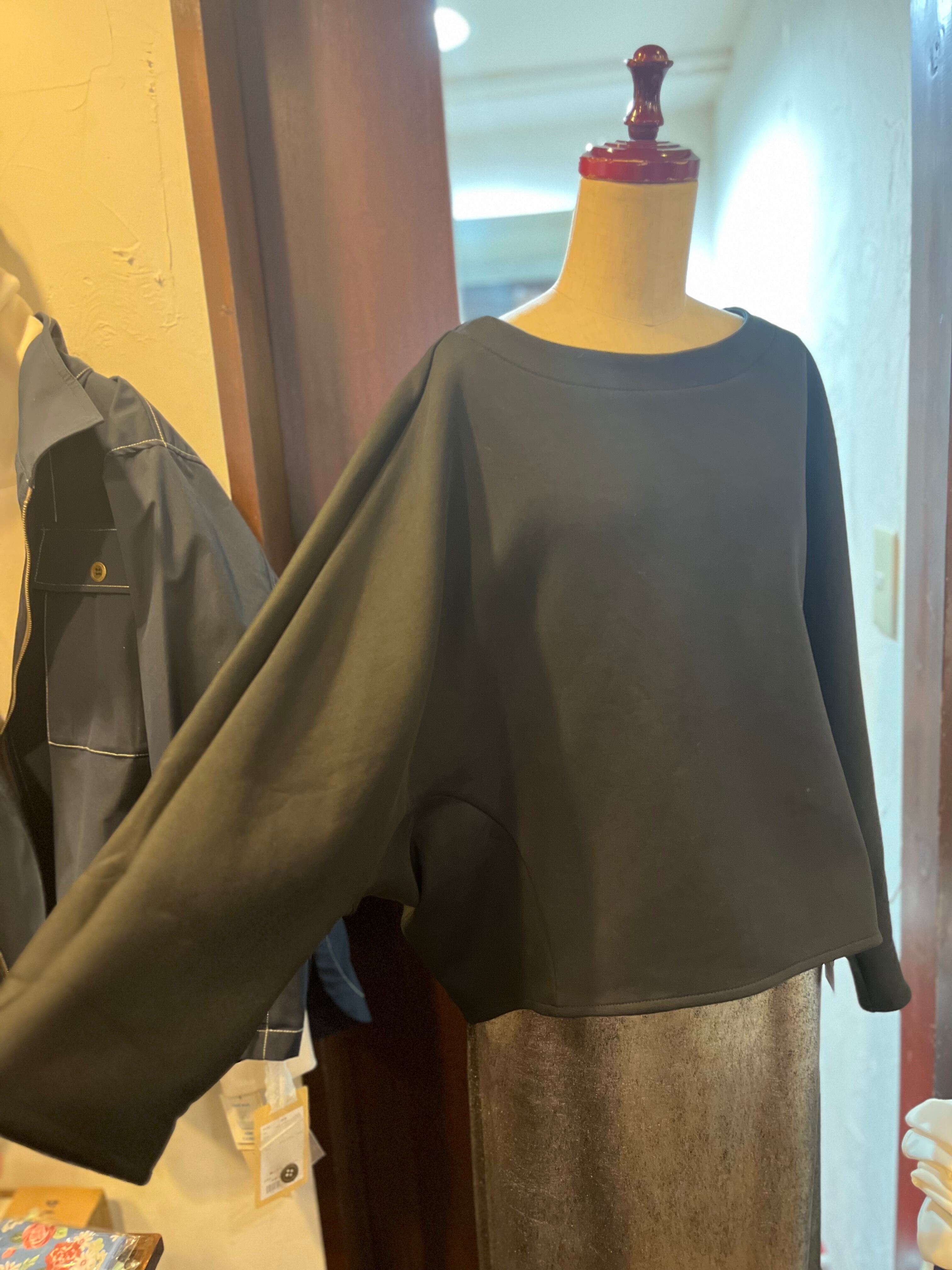 きれいな開きのボートネックデザインで、レイヤードスタイルにもぴったりなアイテムです。コクーンシルエットがゆったりしたデザインもバランス良く着こなせて、洗練された大人テイストに