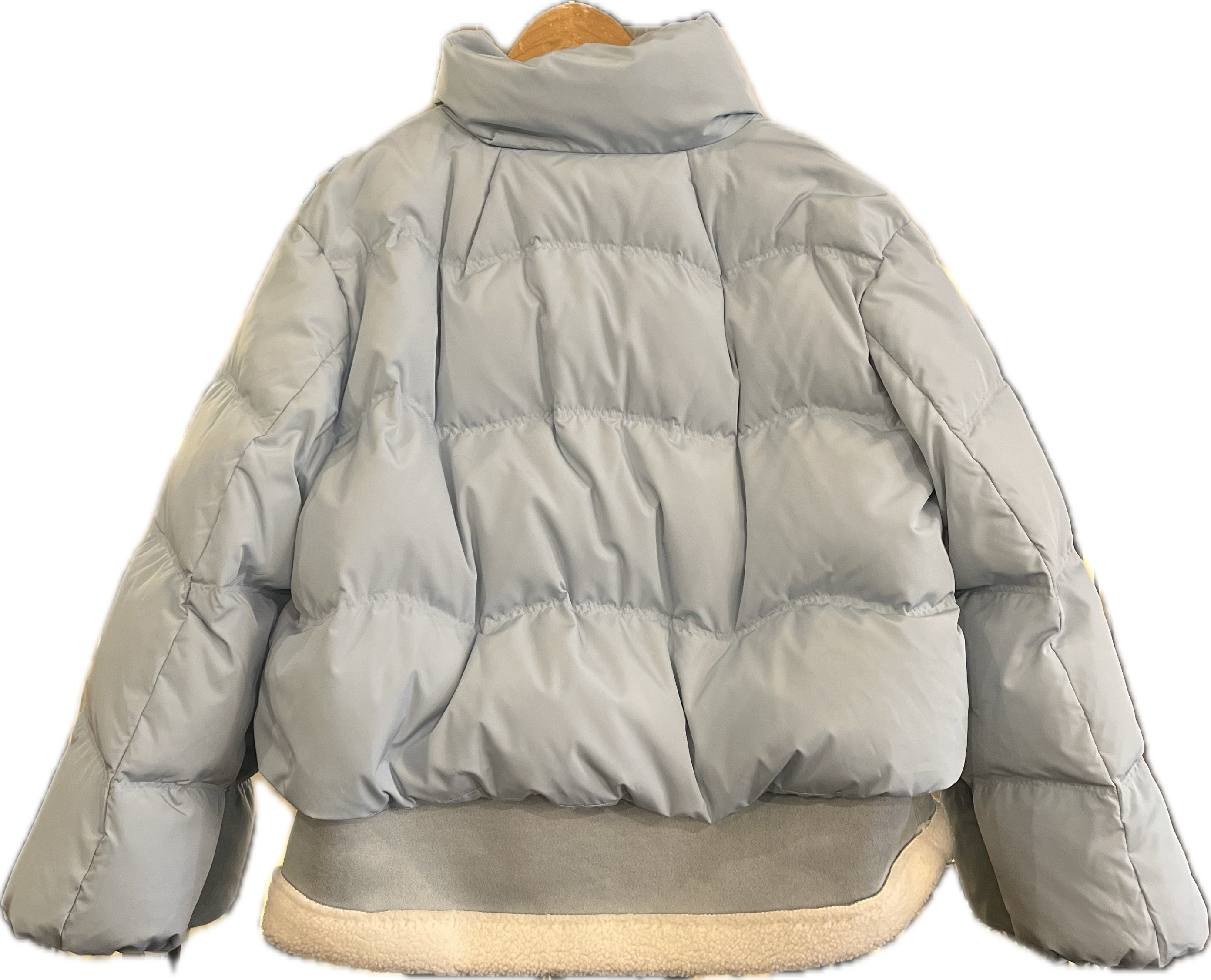 スモーキーなライトブルーが上品な印象のダウンブルゾン。