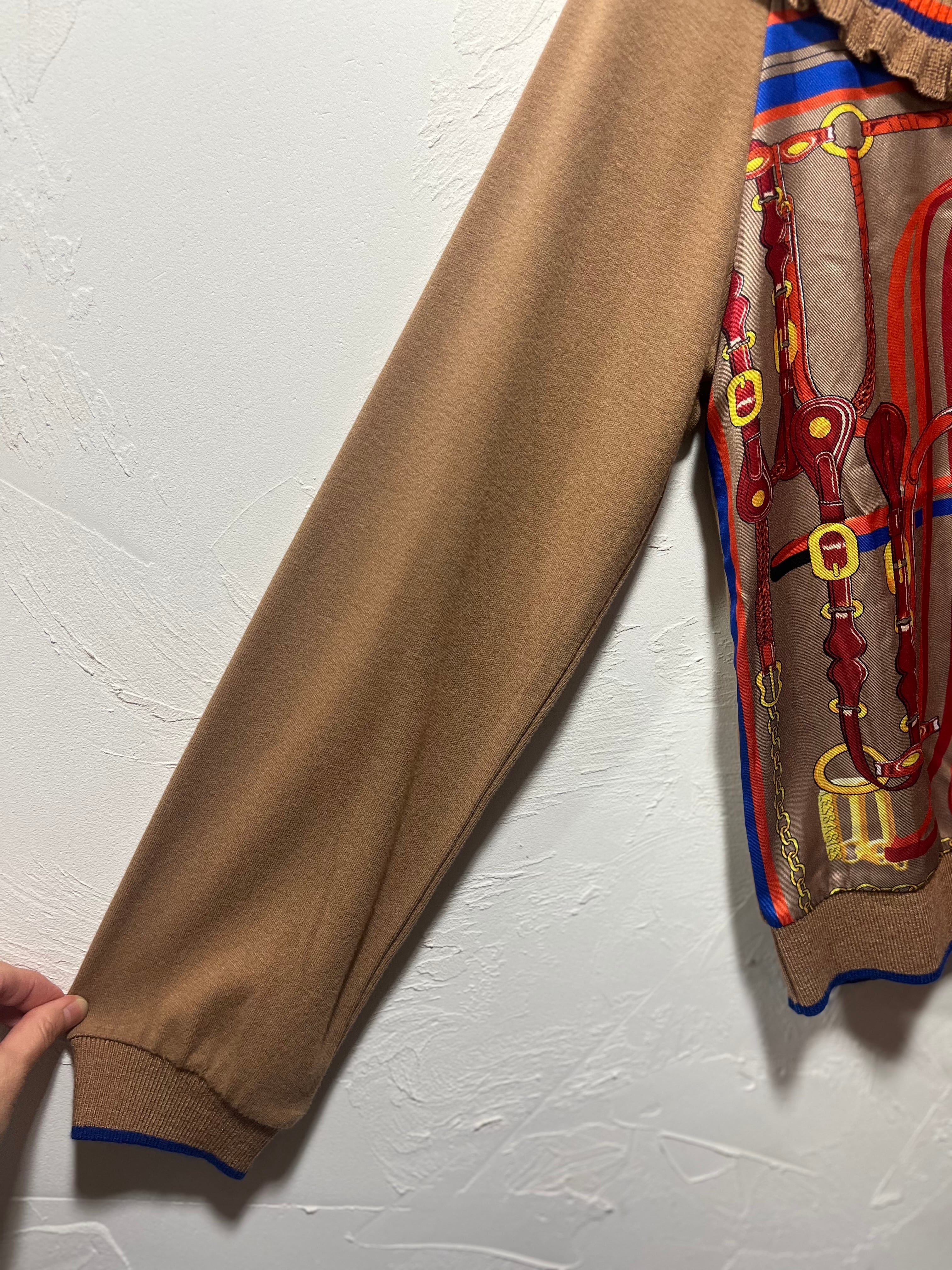 ソフトで着心地の良いニット素材に、スカーフ柄のサテン素材を組み合わせた異素材デザイン。