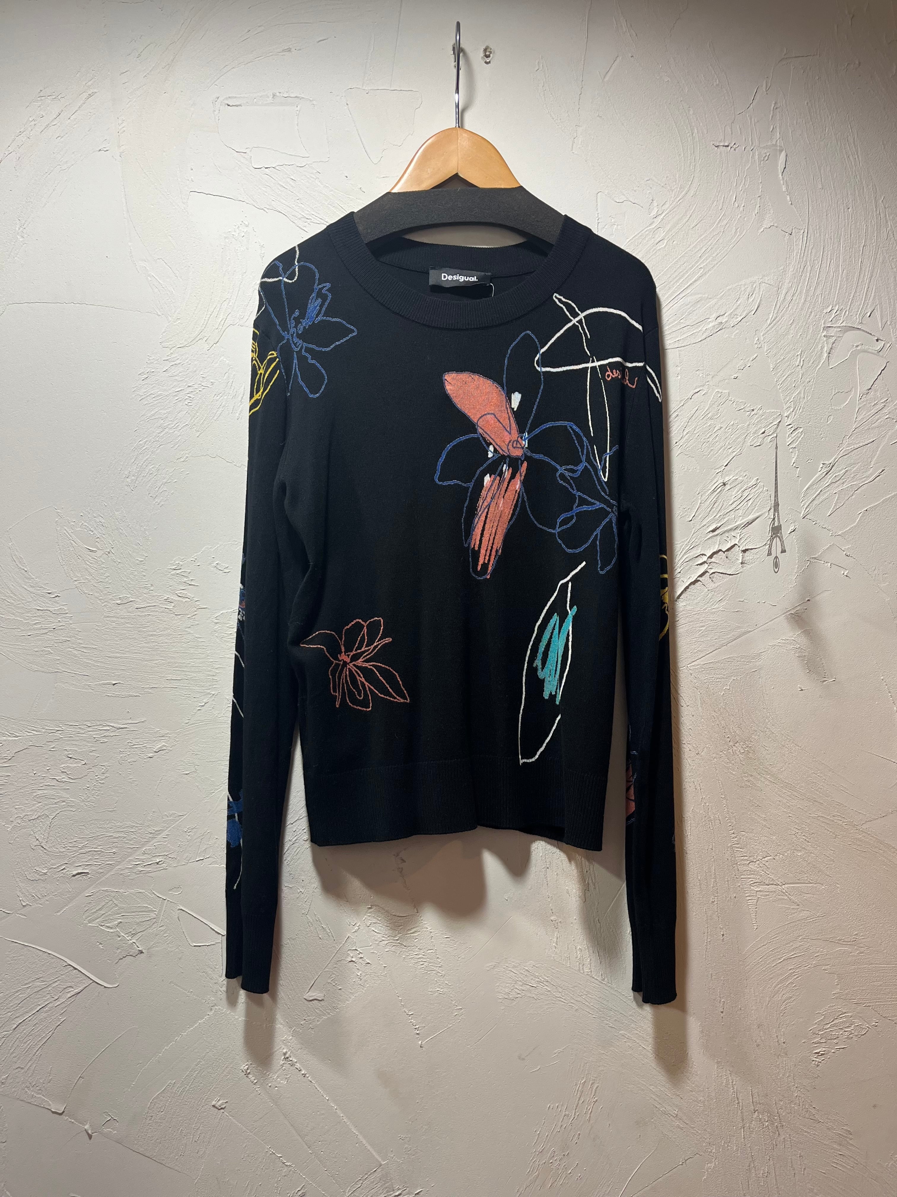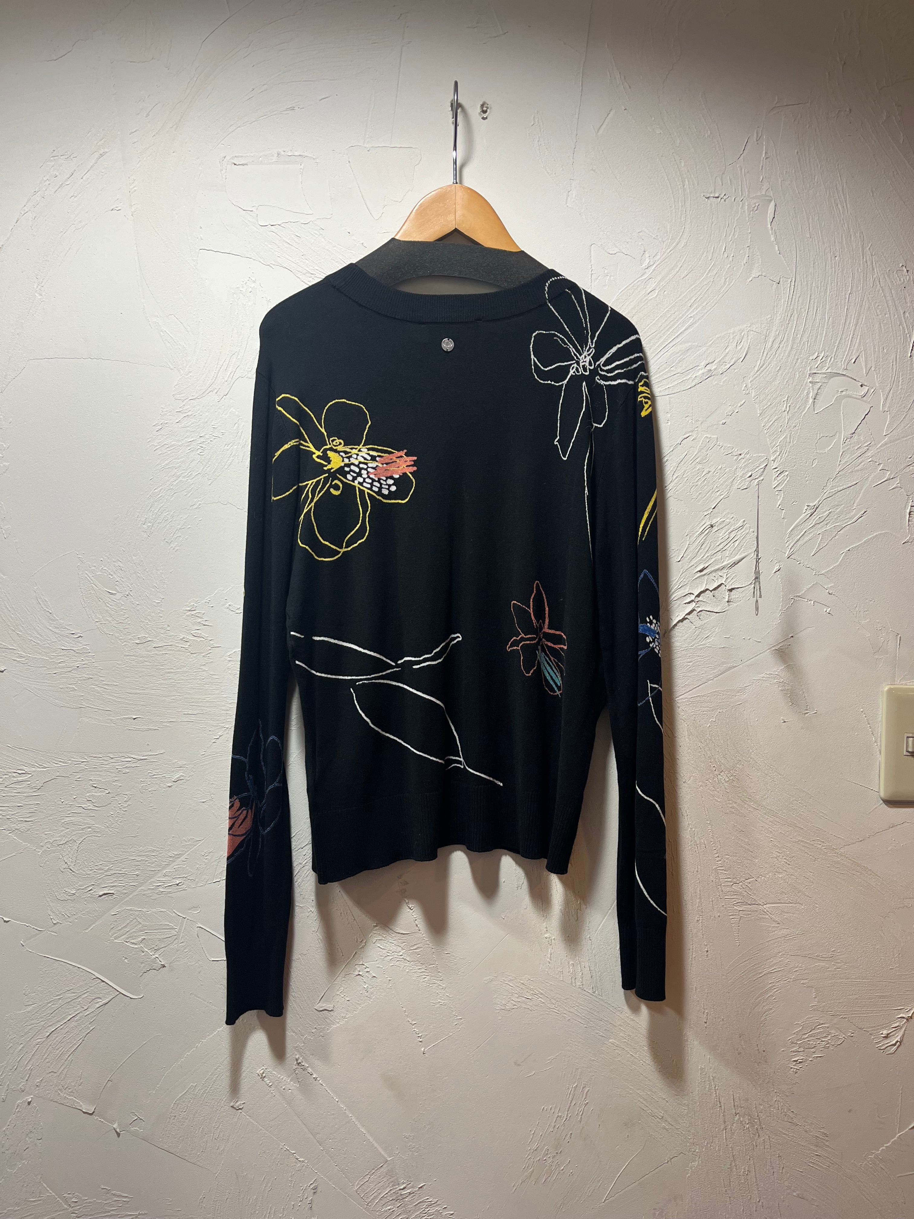 やわらかなストレッチ素材が心地よい着心地を提供するDesigualのフラワー柄丸首ニット。