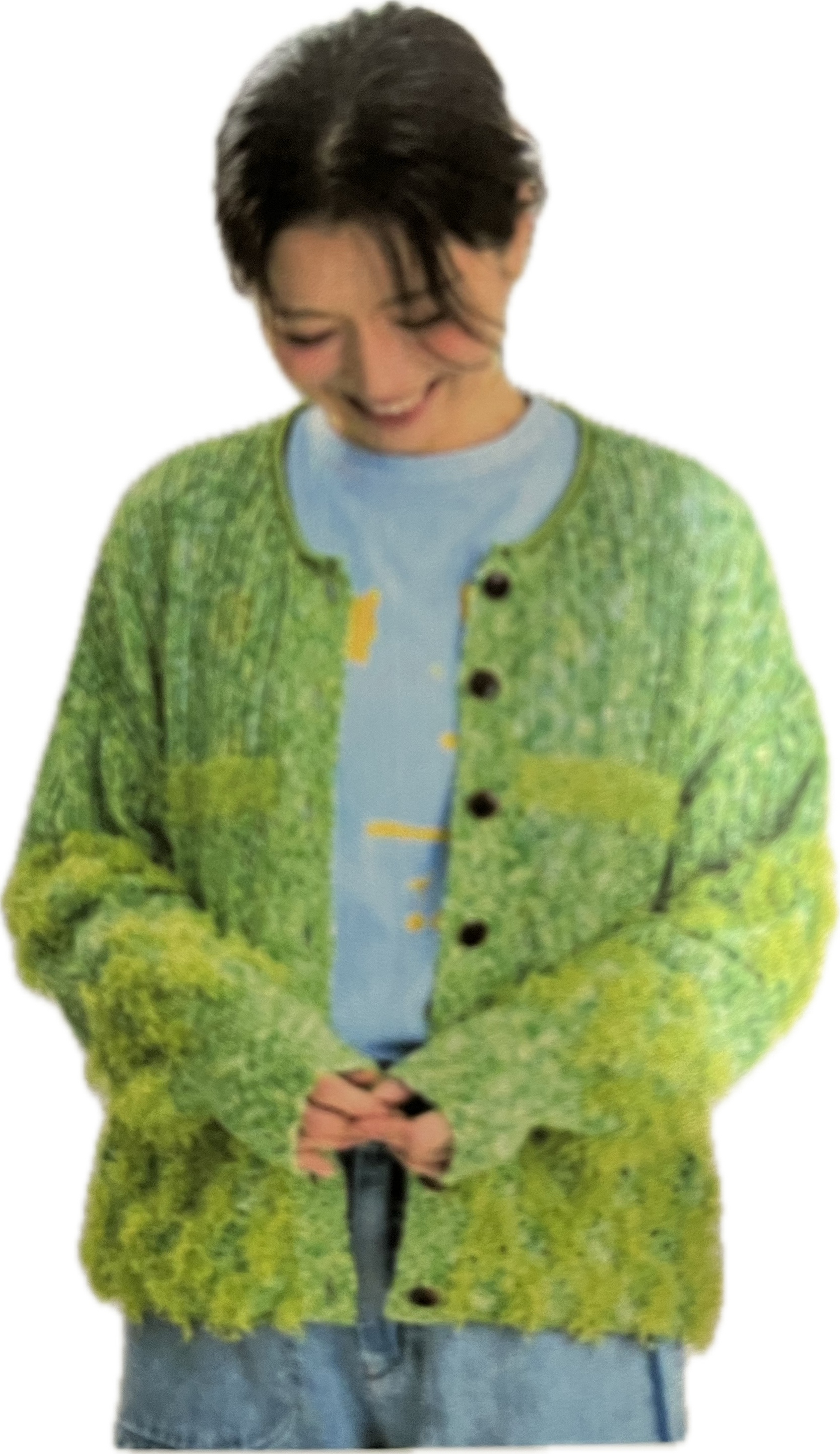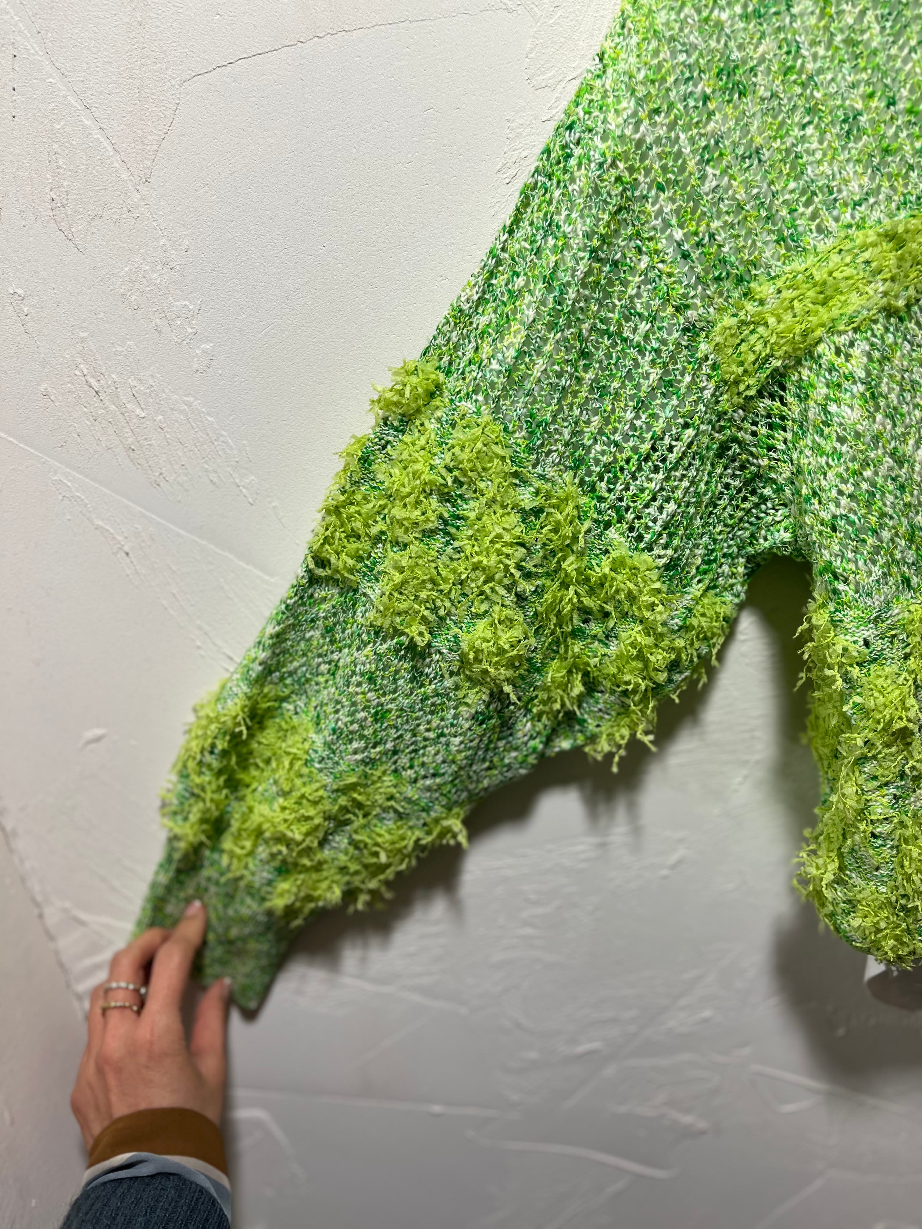 かすりスラブ糸とペーパーモールを組み合わせたジャガードカーディガン。