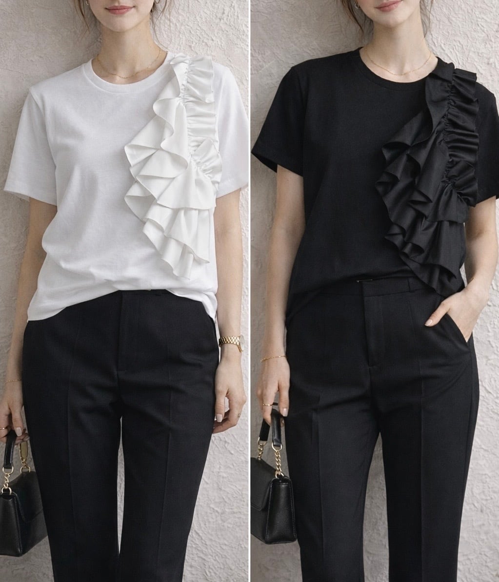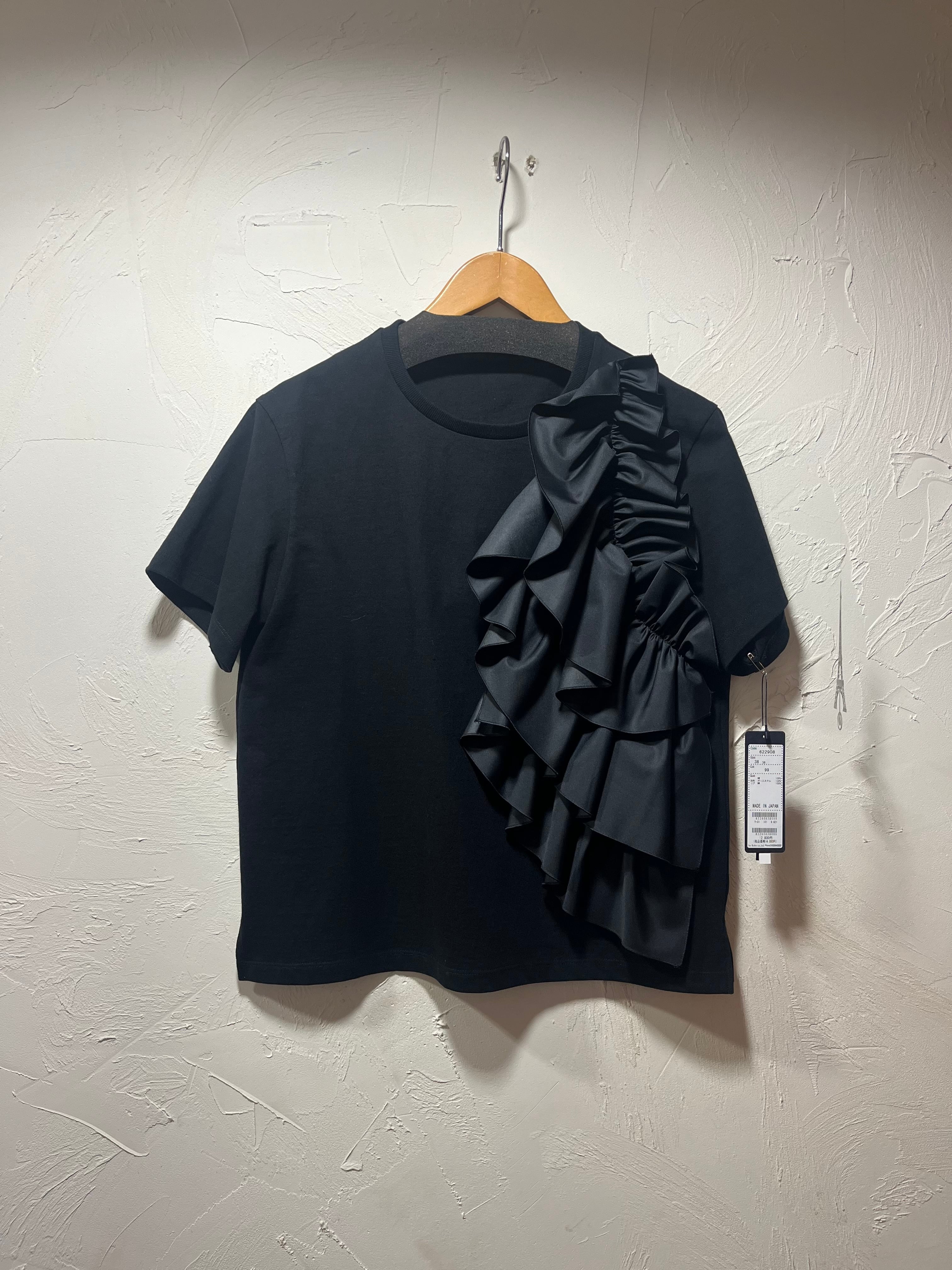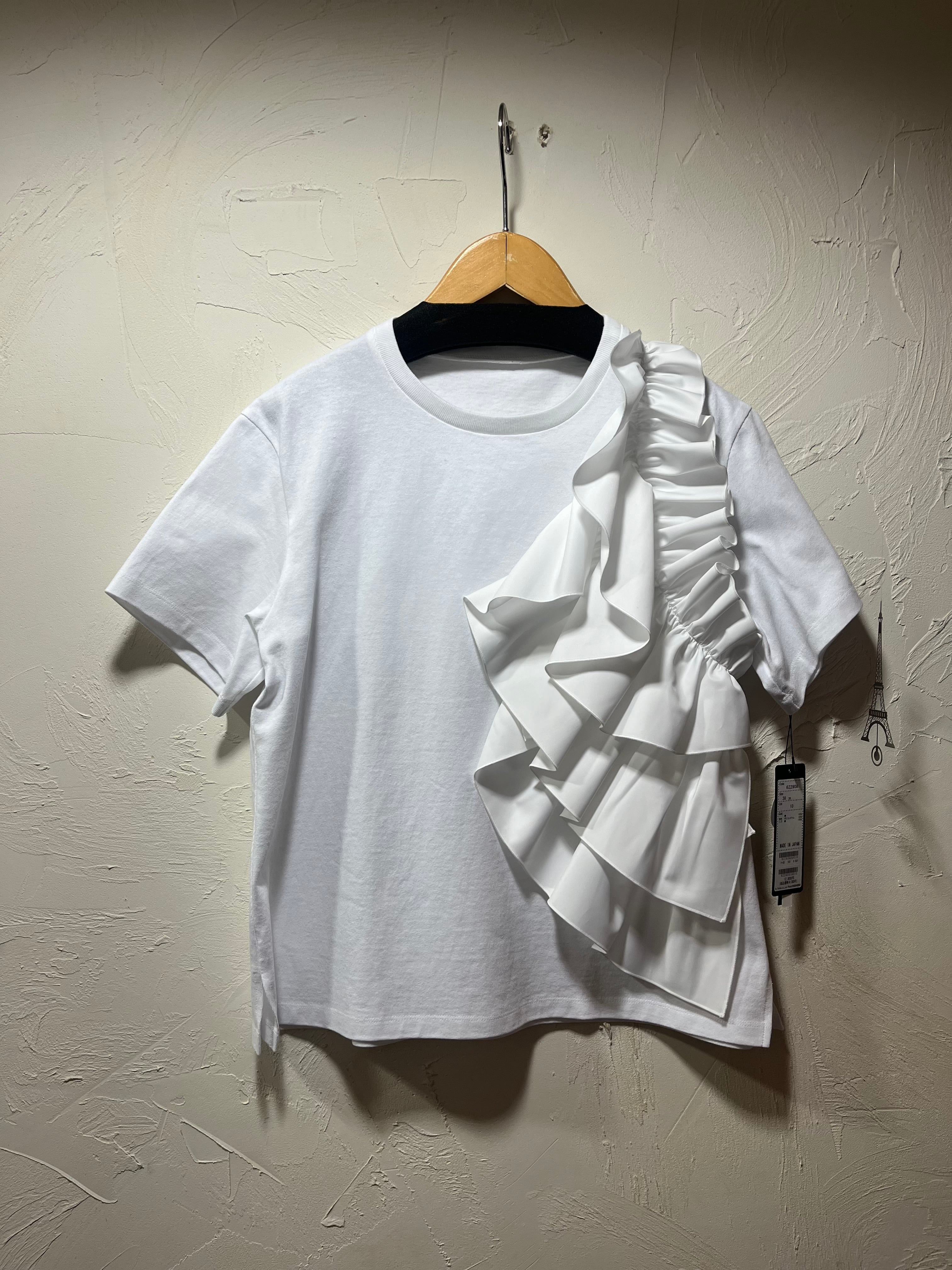 マットなさらりとした肌触りが心地よいコットン素材のカットソーに、張りのあるポリエステルのフリルが大胆にあしらわれたデザインが魅力的☆☆