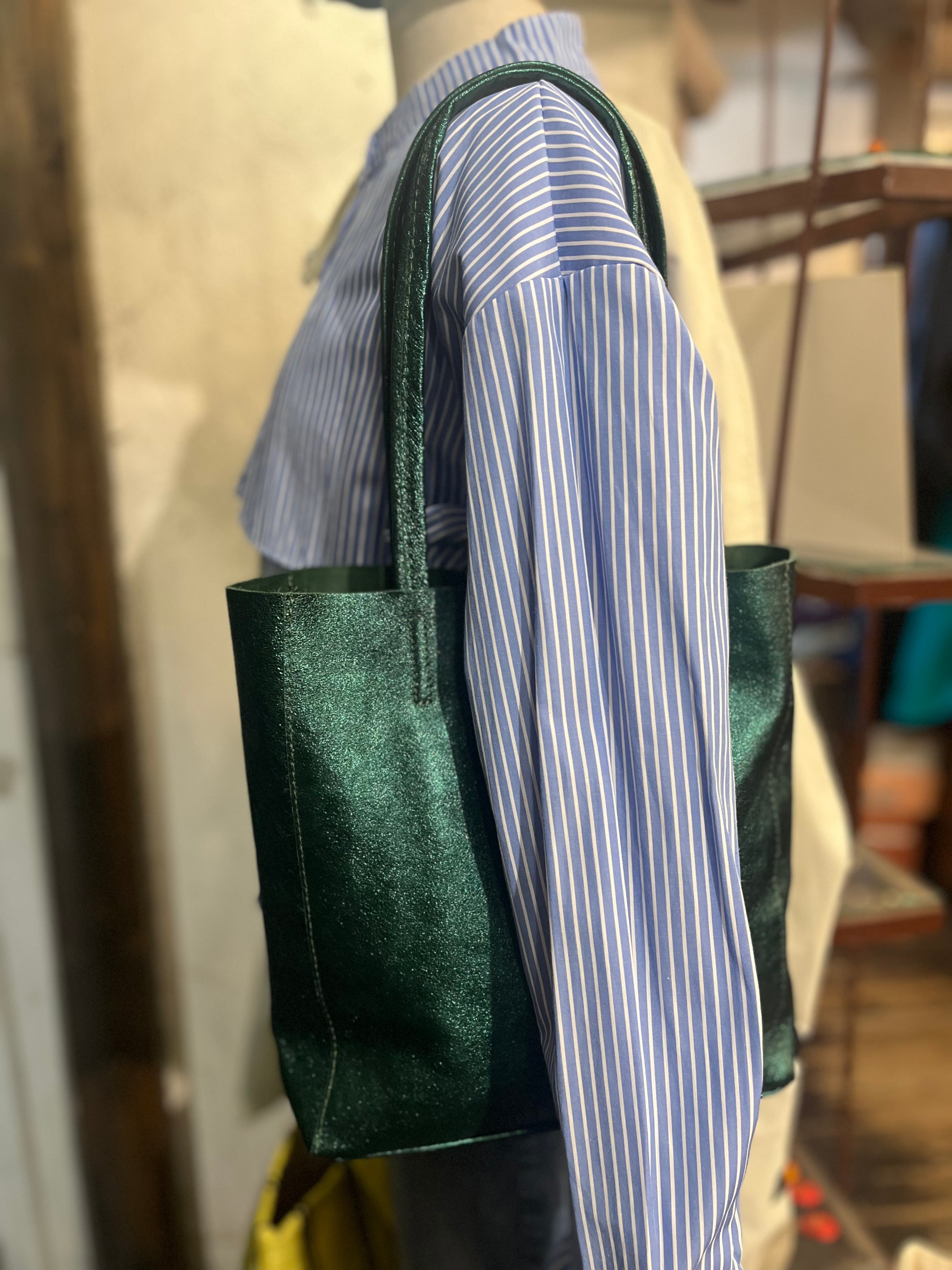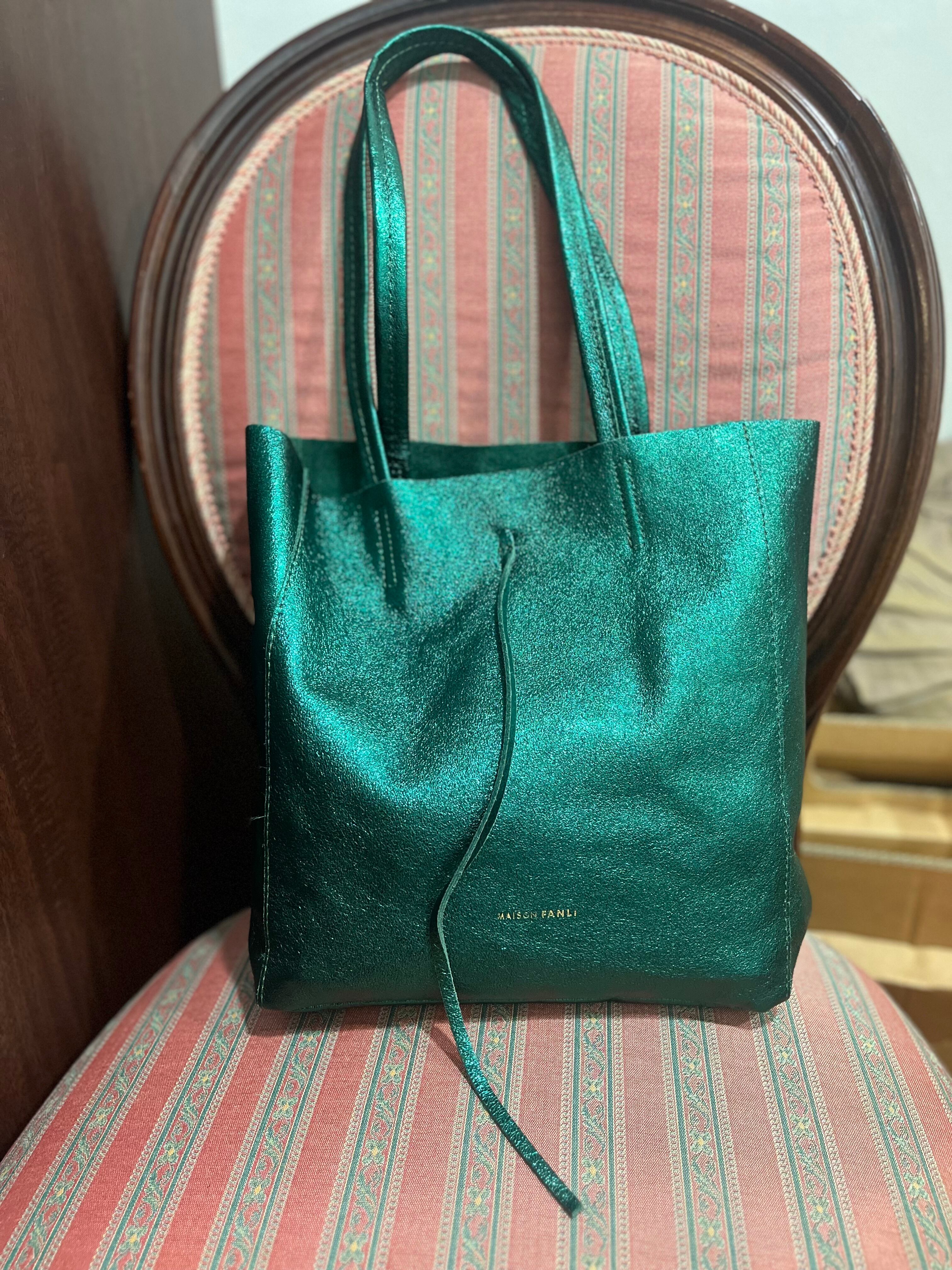 洗練されたデザインが光るMAISON FANLIのメタリックグリーンレザートートバック☆