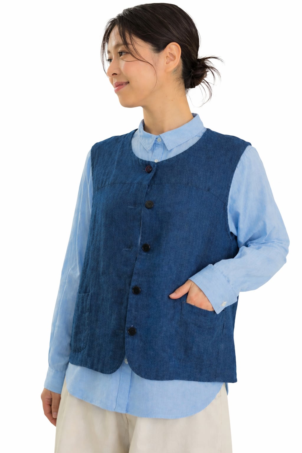 オリジナル作成されたデニムガーゼ素材を使用したデニムガーゼコクーンベスト。