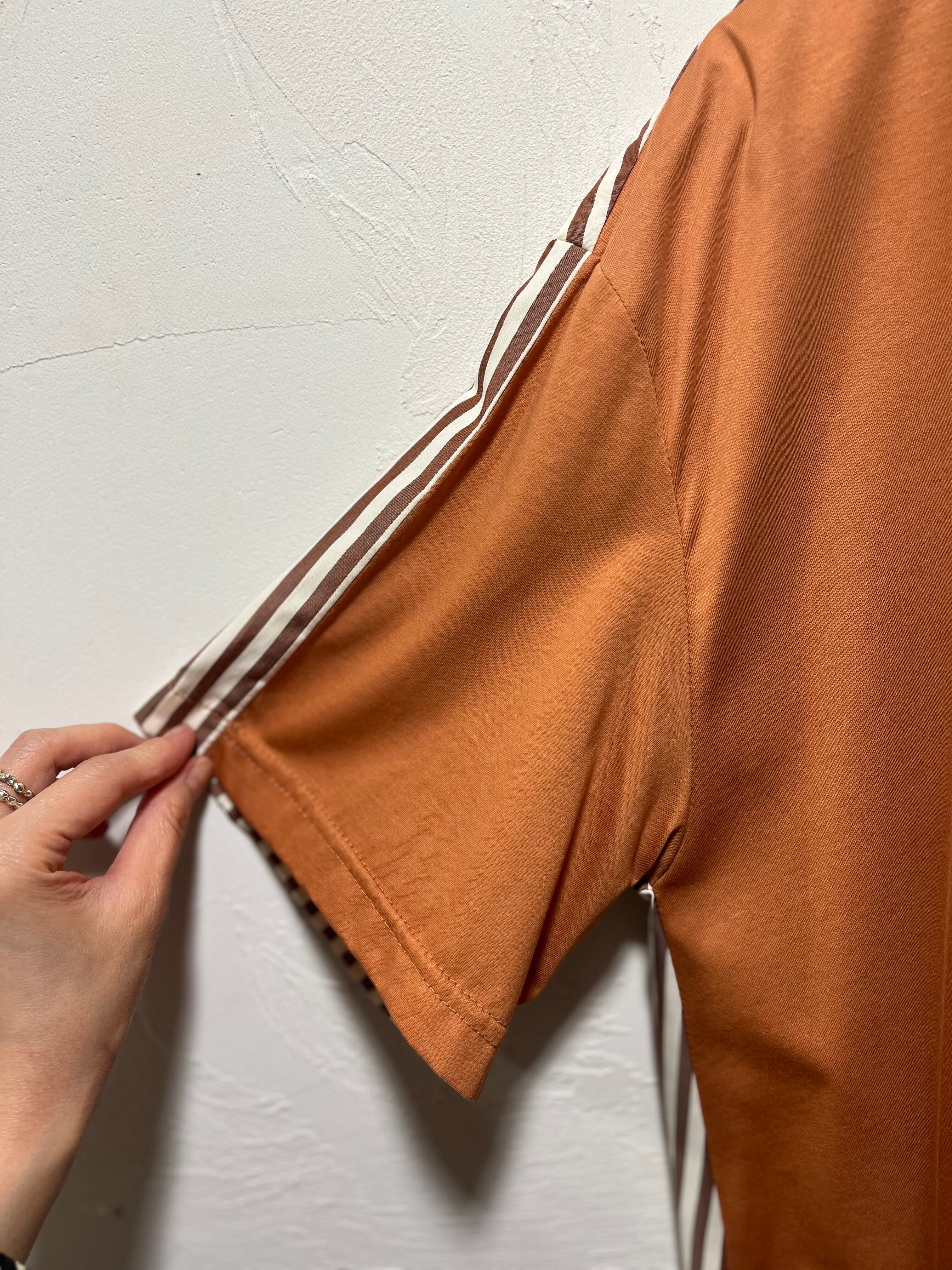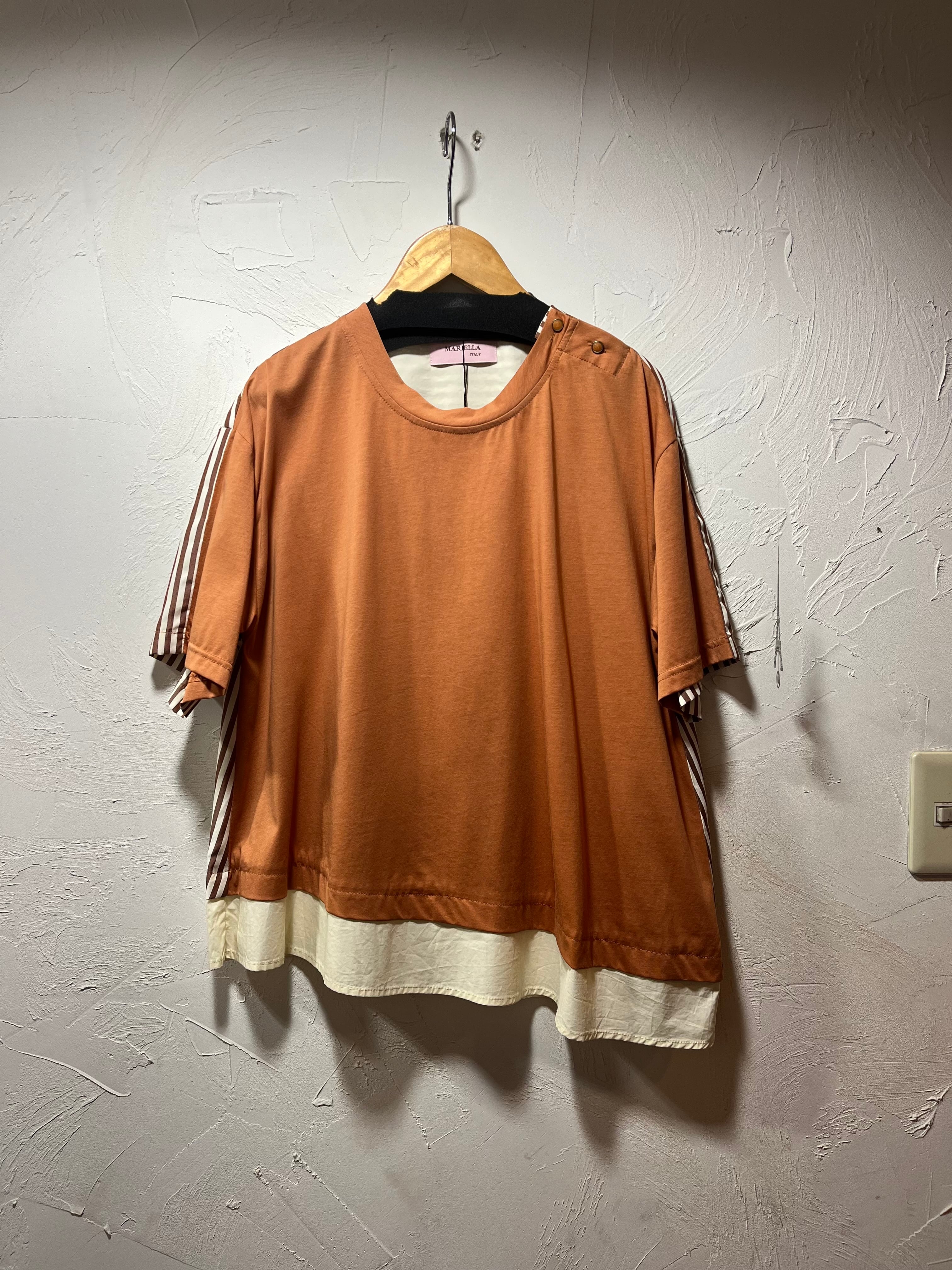 テラコッタカラーにバックストライプ柄が印象的で、動きのある斜めの裾ライン。