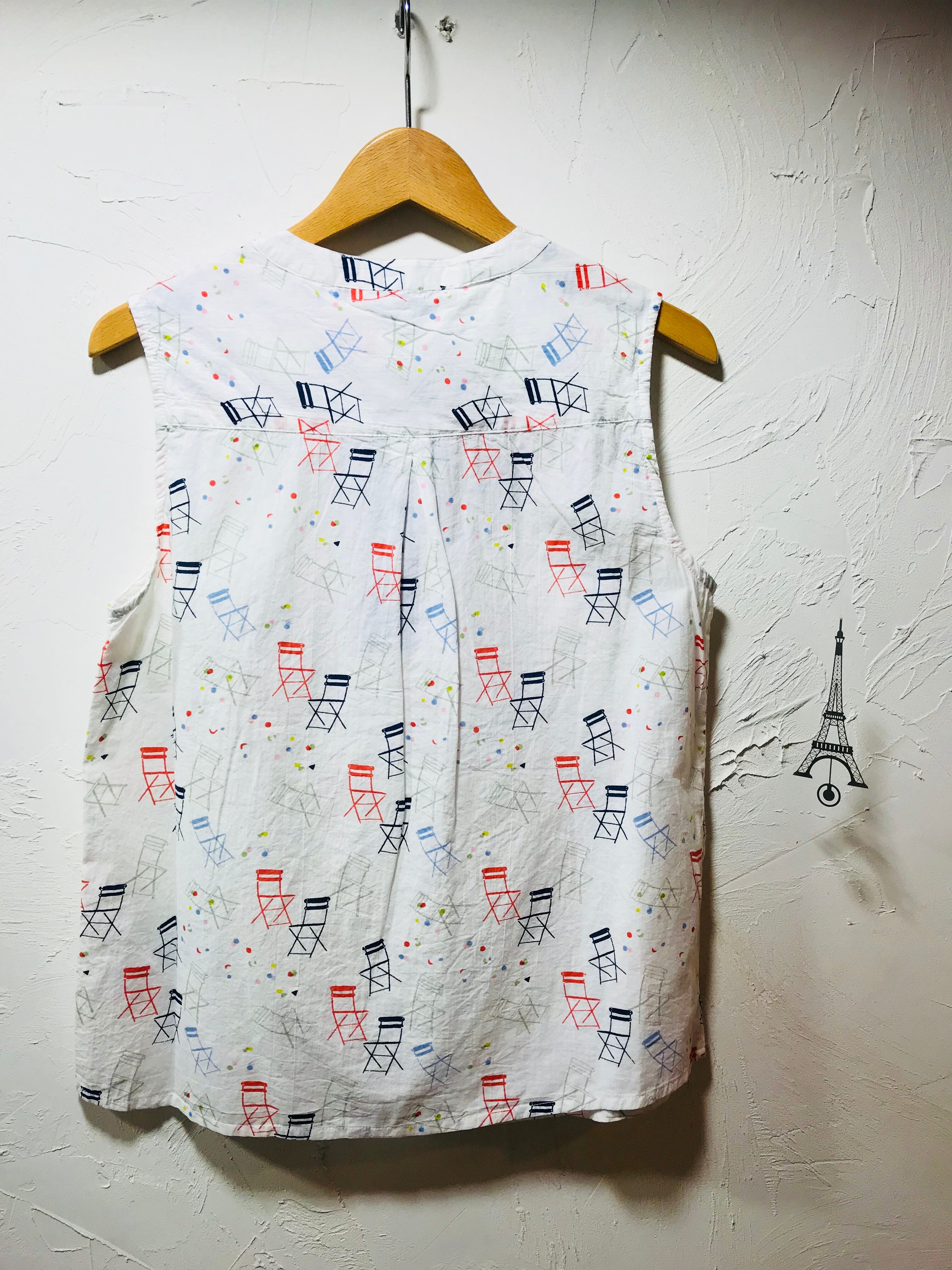 レトロなテイストがキュートなチェアープリントのノーカラーノースリーブデザインが入荷♪