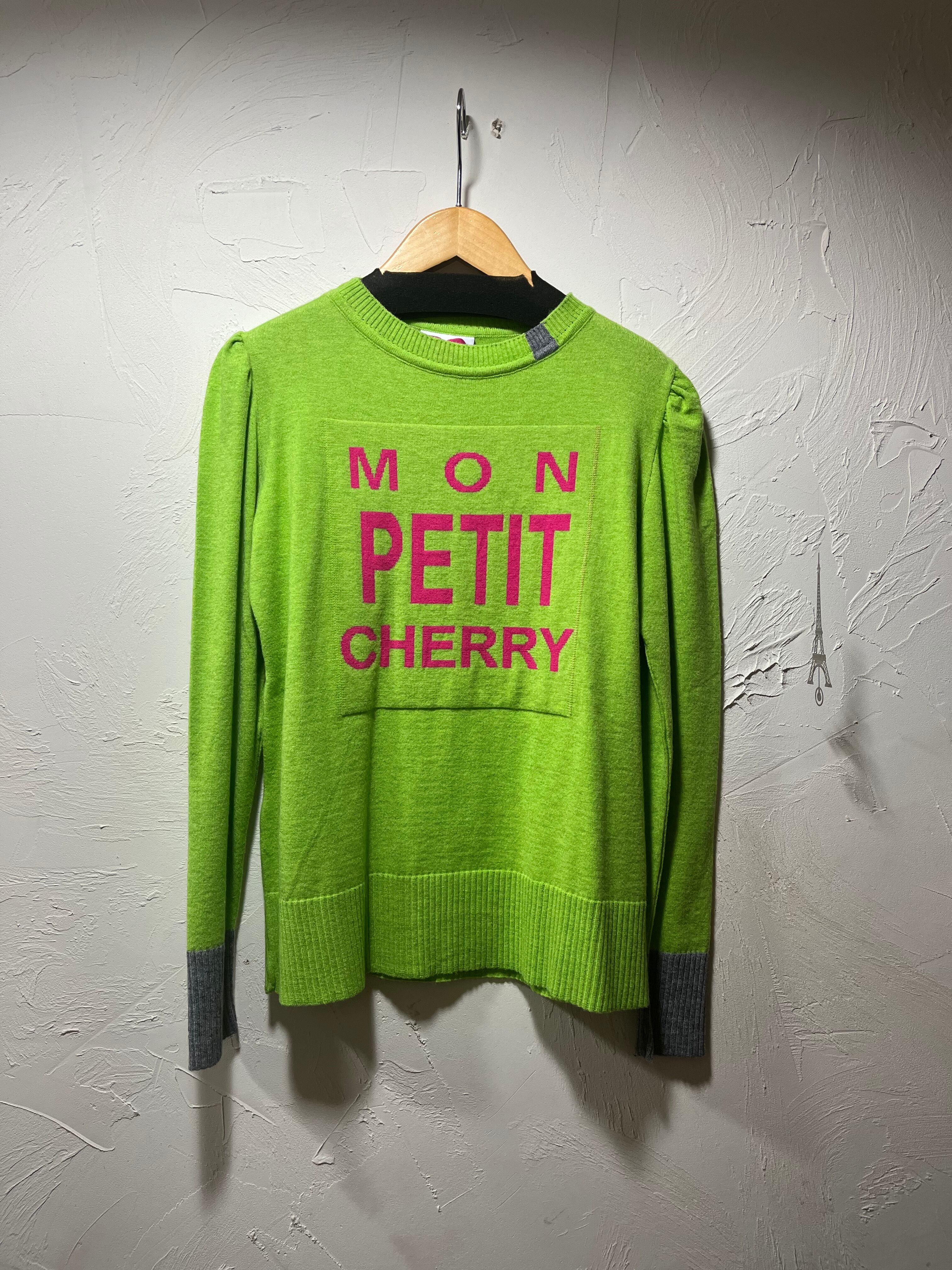 鮮やかなイエローグリーンベースに、ビビットなマゼンタピンクカラーのロゴがキュートなプルニット☆☆