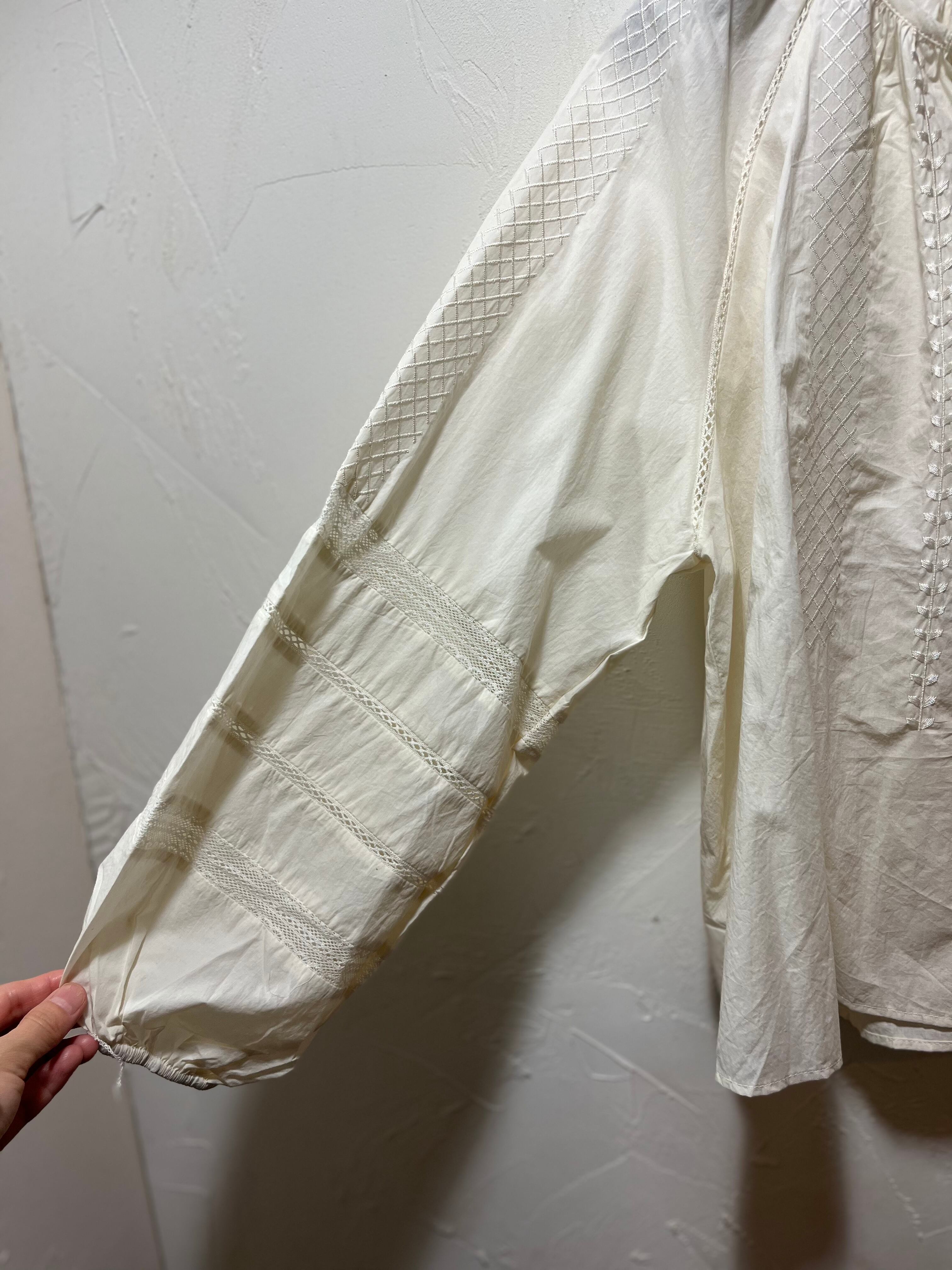 丁寧な刺繍と繊細なレースが、シャツスモックに華やかさをもたらしています。アイボリーカラーが肌にやさしく映える一枚は、女性らしさを引き立て、優雅な雰囲気を演出します。