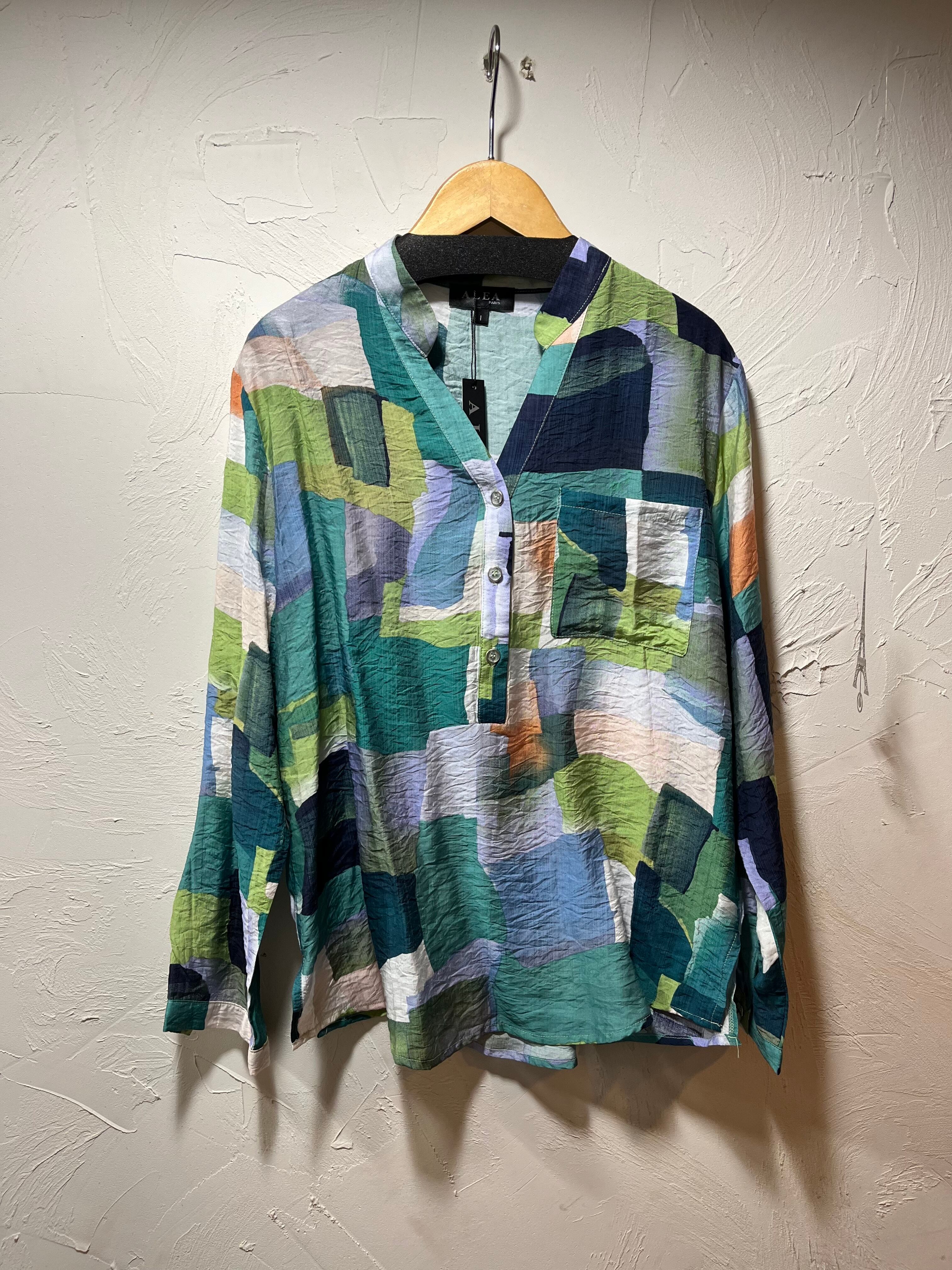 Vネックとマオカラーが女性らしさを引き立て、グリーンを基調とした春らしいプリントが目を引く一枚。