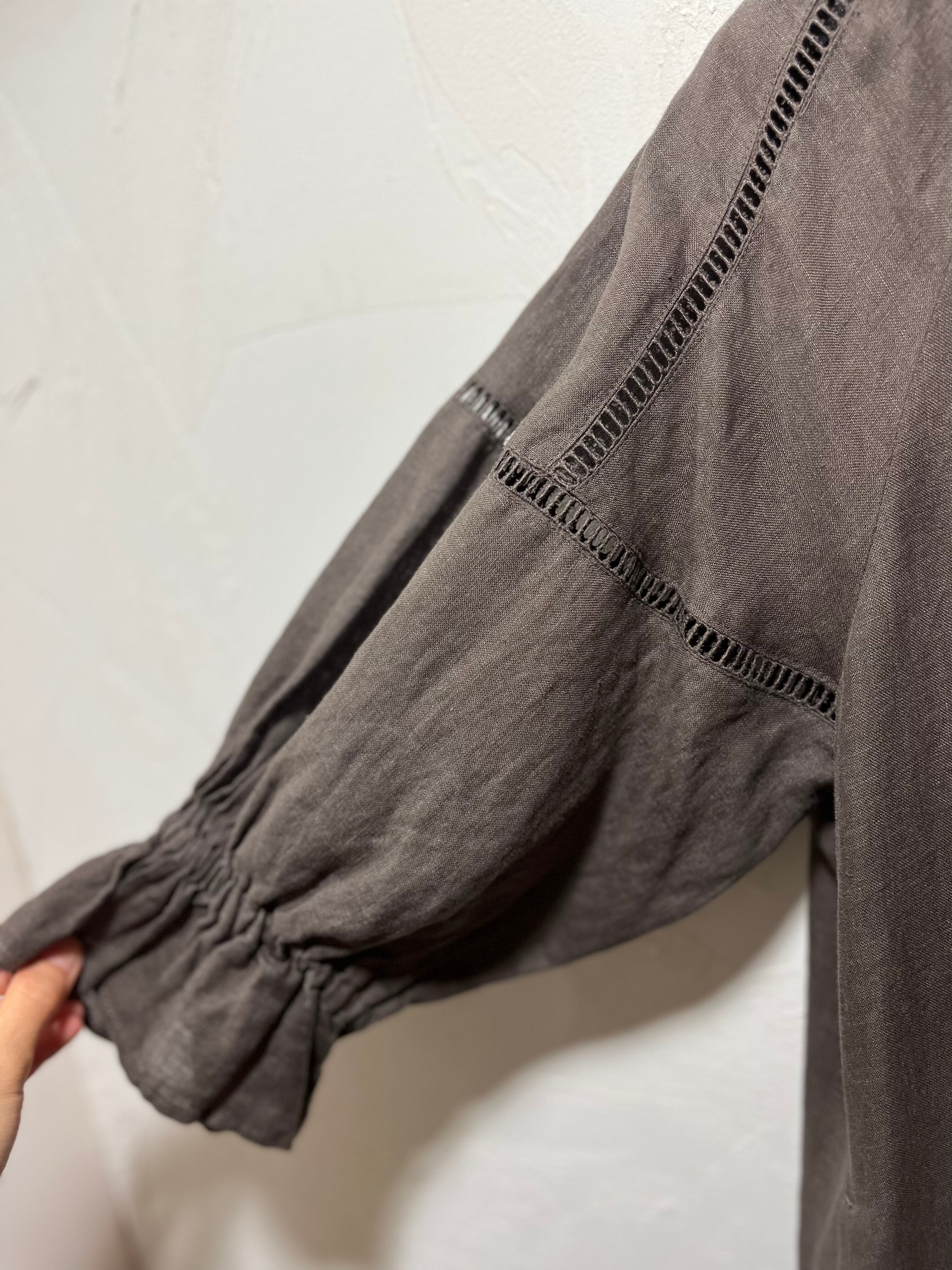 落ち着いたモカブラウンカラーが晩夏のコーディネートにぴったりなBlue Fronceのフレンチリネン素材スモックワンピース。