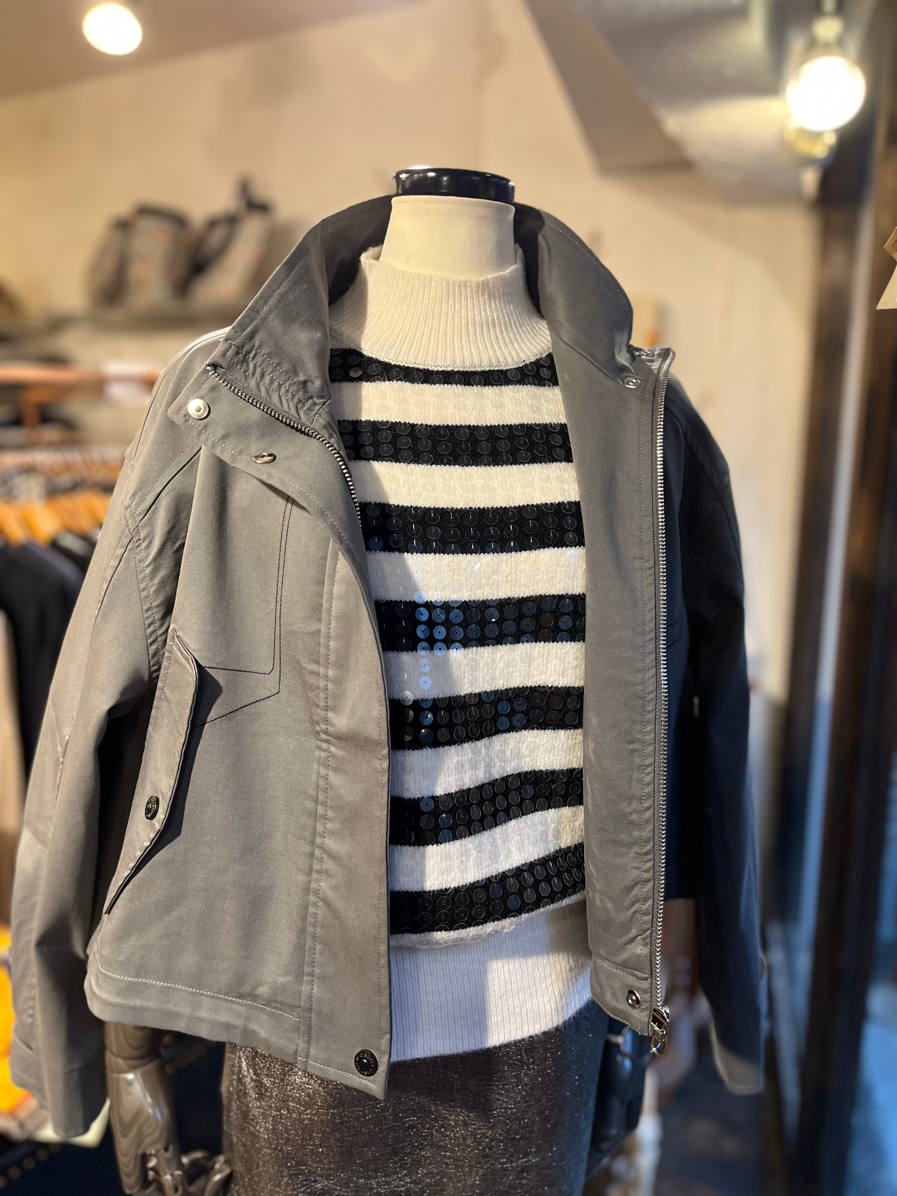 前見頃のクリアスパンがポイントとなったボーダー柄は、シンプルながらも存在感を際立たせ、スタイルを引き立てます。