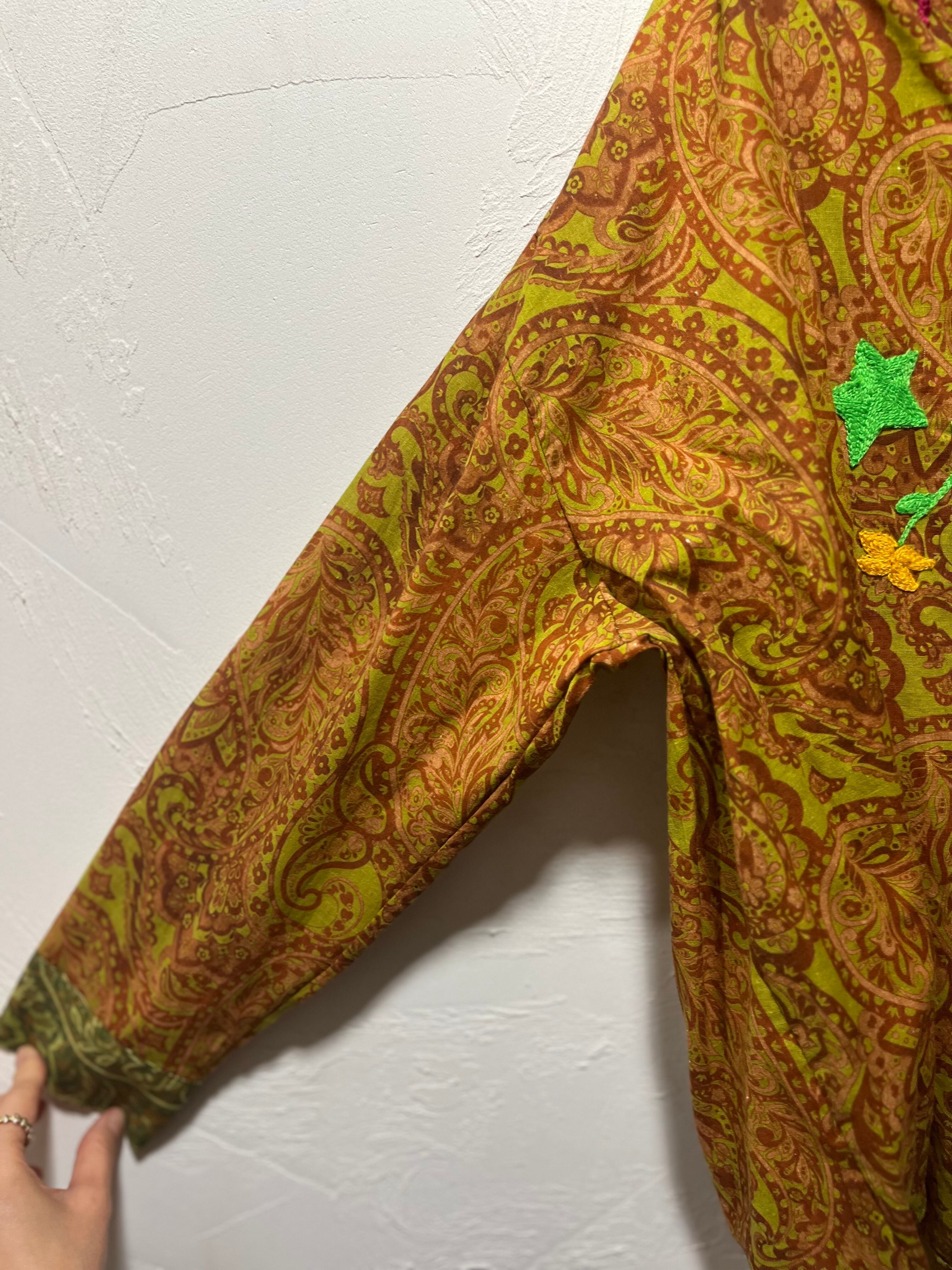 存在感のあるエスニックテイストのペイズリー柄に、キュートな刺繍が施されており、コーディネートの主役にぴったり!