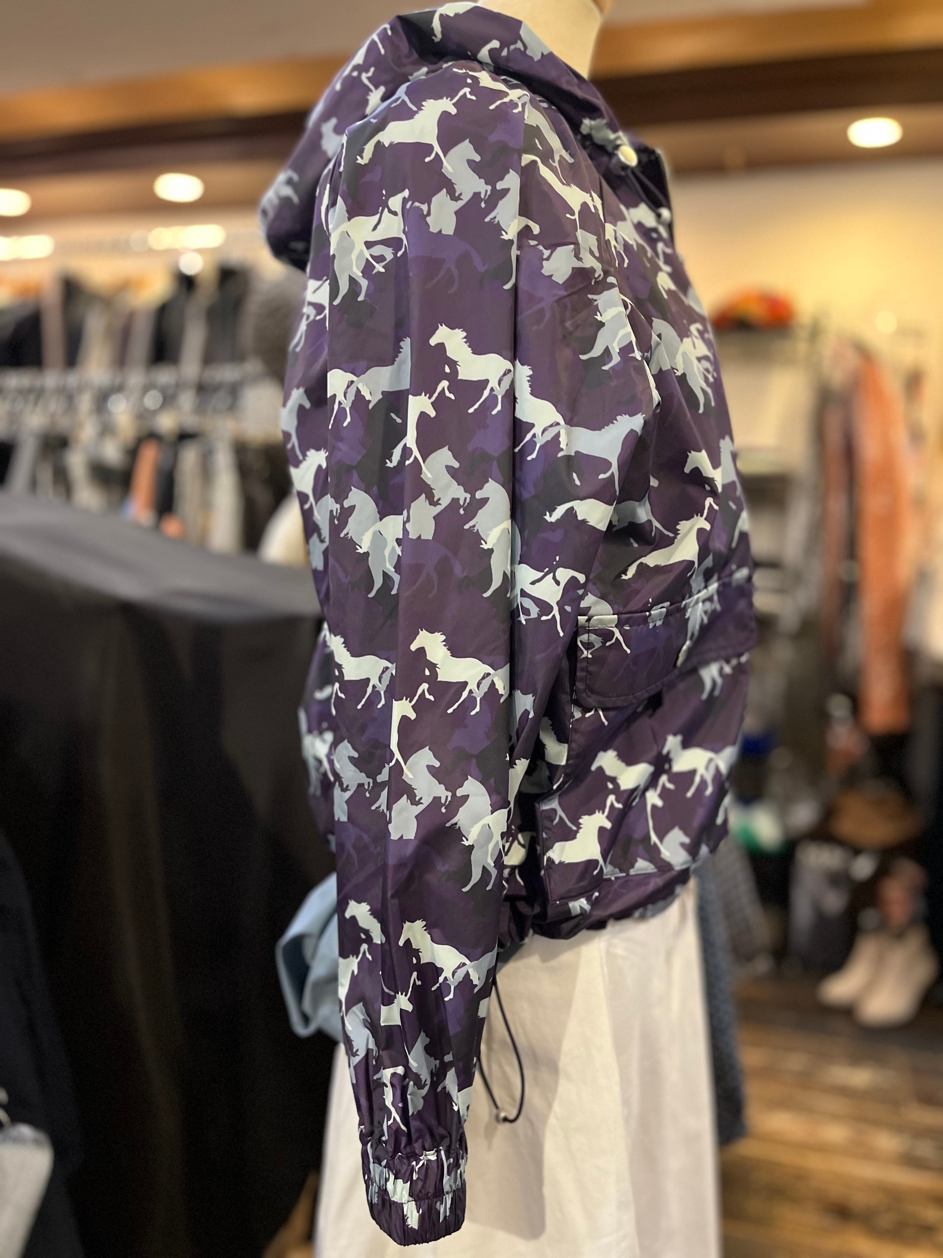 シックなグラデーションカラーが魅力のホース柄と、楽しげなミックス柄が特徴のフードブルゾンです。